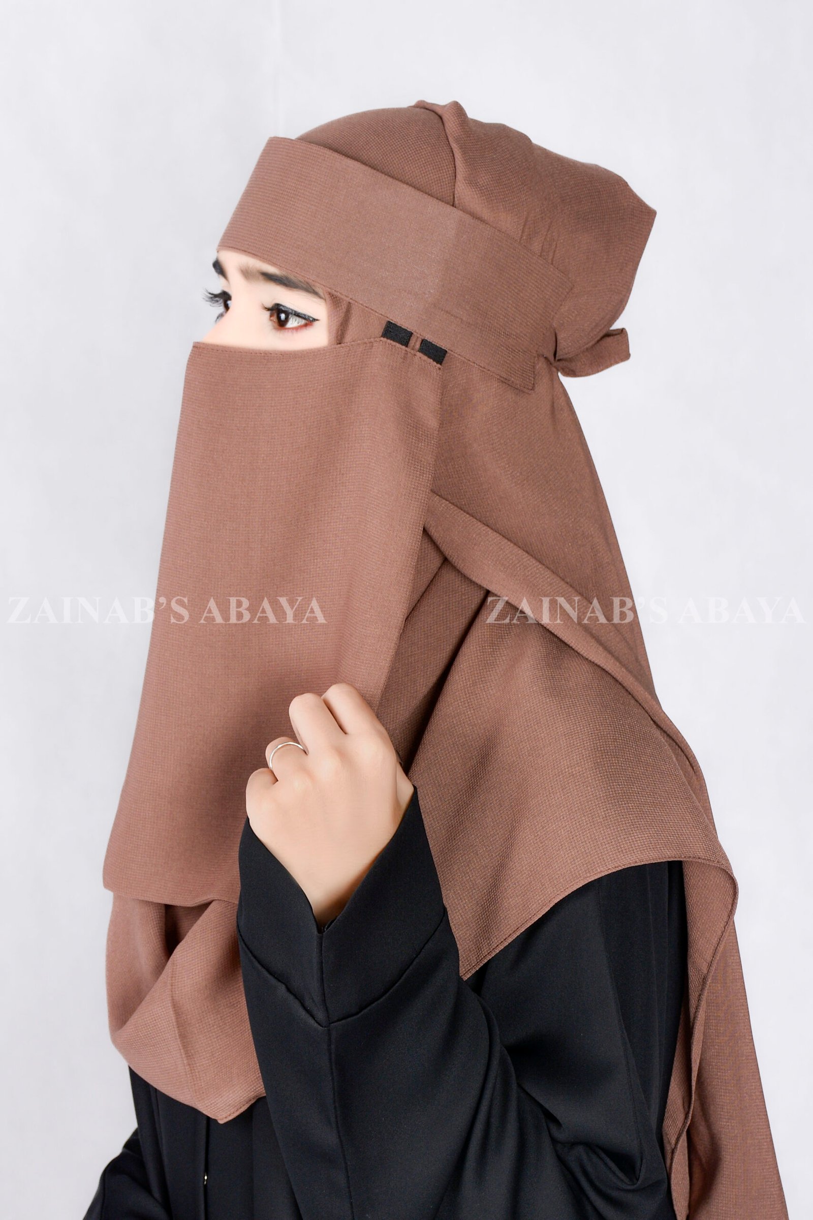 Elegant Saudi Niqab in Skin color made with breathable fabric. A premium Saudi niqab with logo from Zainab Designer Abaya, combining modesty, comfort, and affordability. Perfect for daily wear or special occasions.
