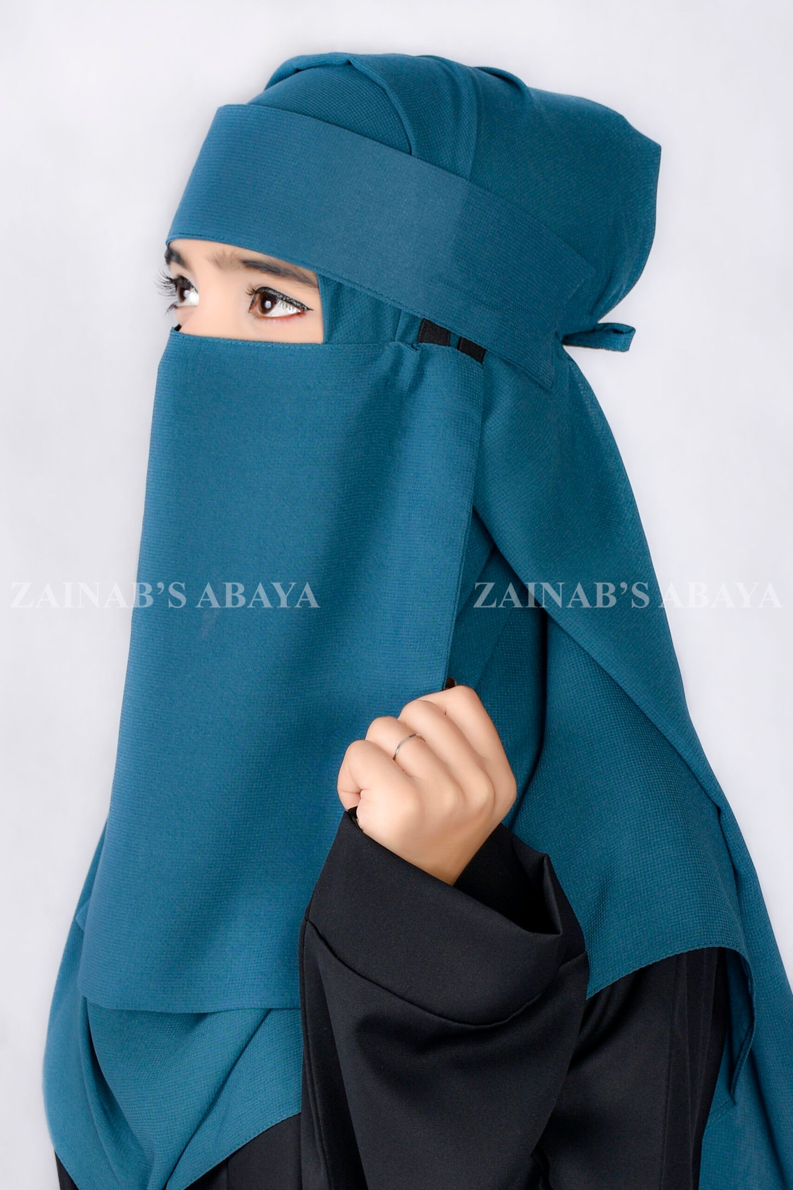 Elegant Saudi Niqab in Zinc color made with breathable fabric. A premium Saudi niqab with logo from Zainab Designer Abaya, combining modesty, comfort, and affordability. Perfect for daily wear or special occasions.
