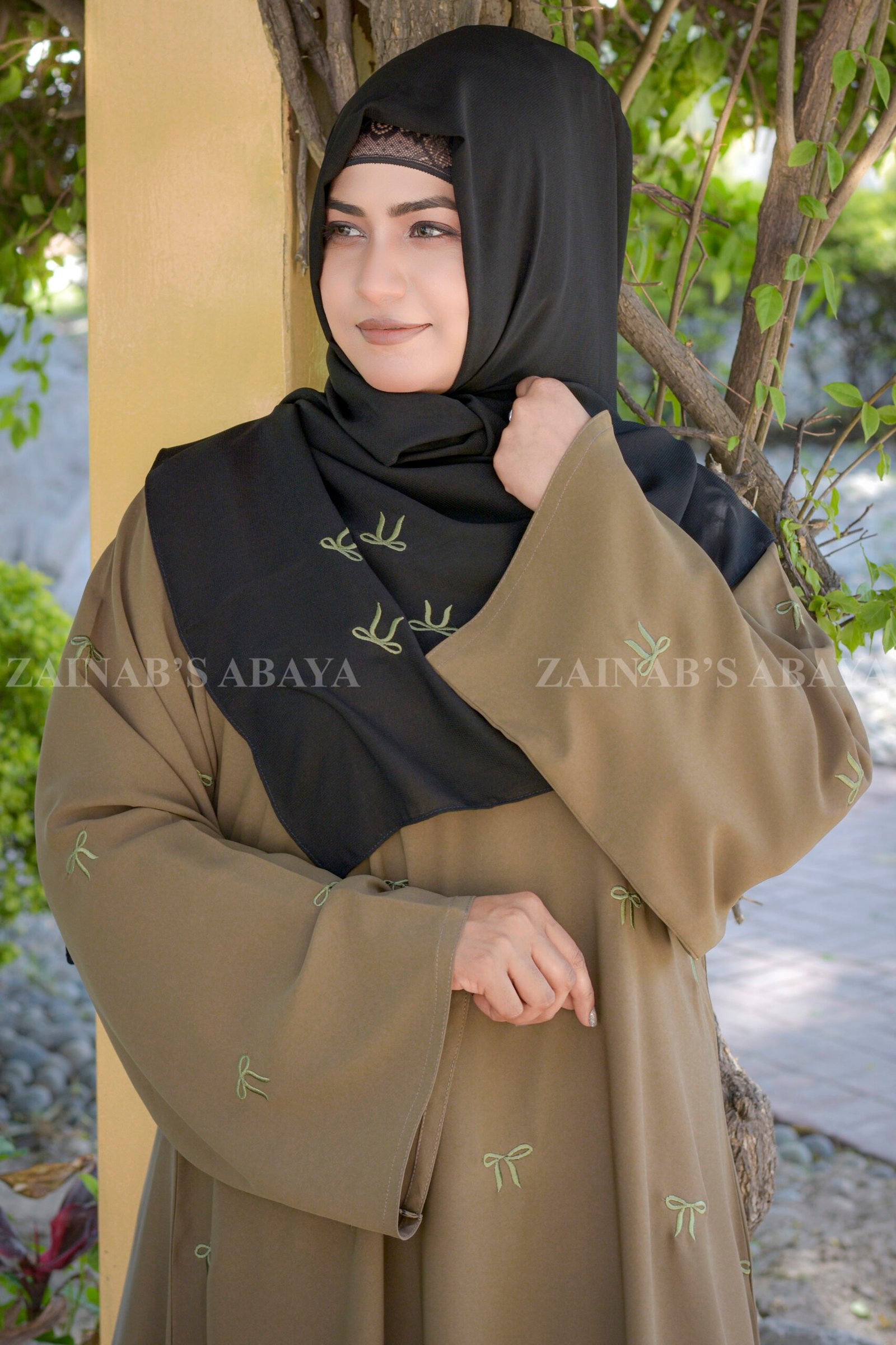 This Skin Color Maxi Abaya, which is crafted from Premium Nida Korean Fabric, has a pretty bow-style embroidery design on the front and sleeves. Including a black color chiffon fabric with the same embroidery pattern.
