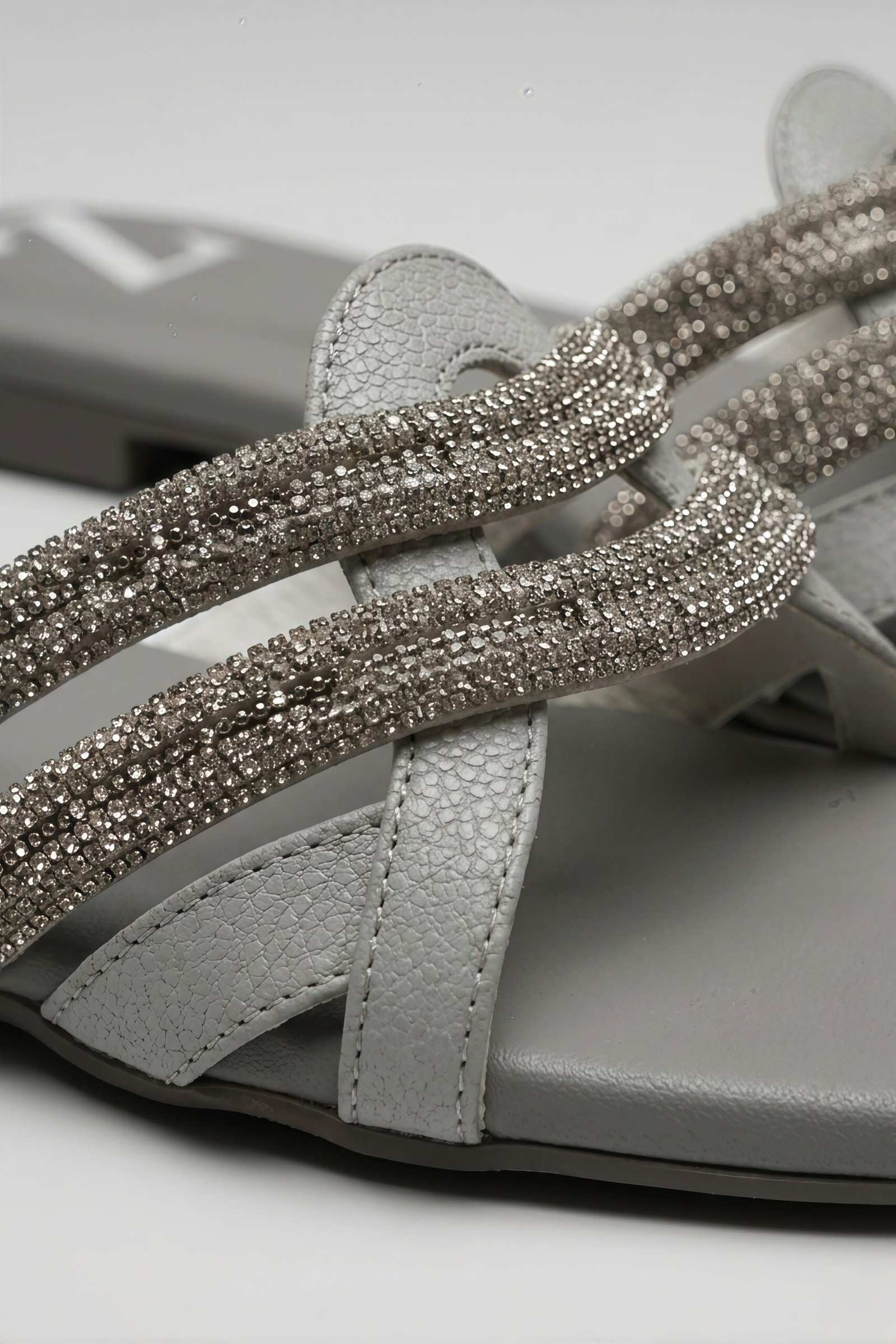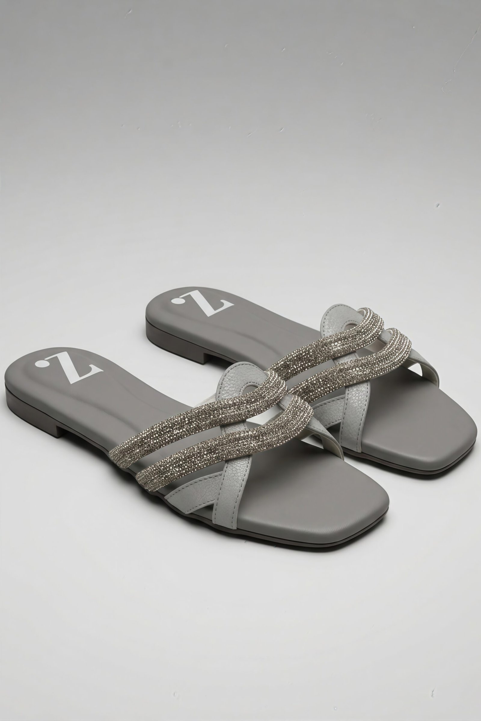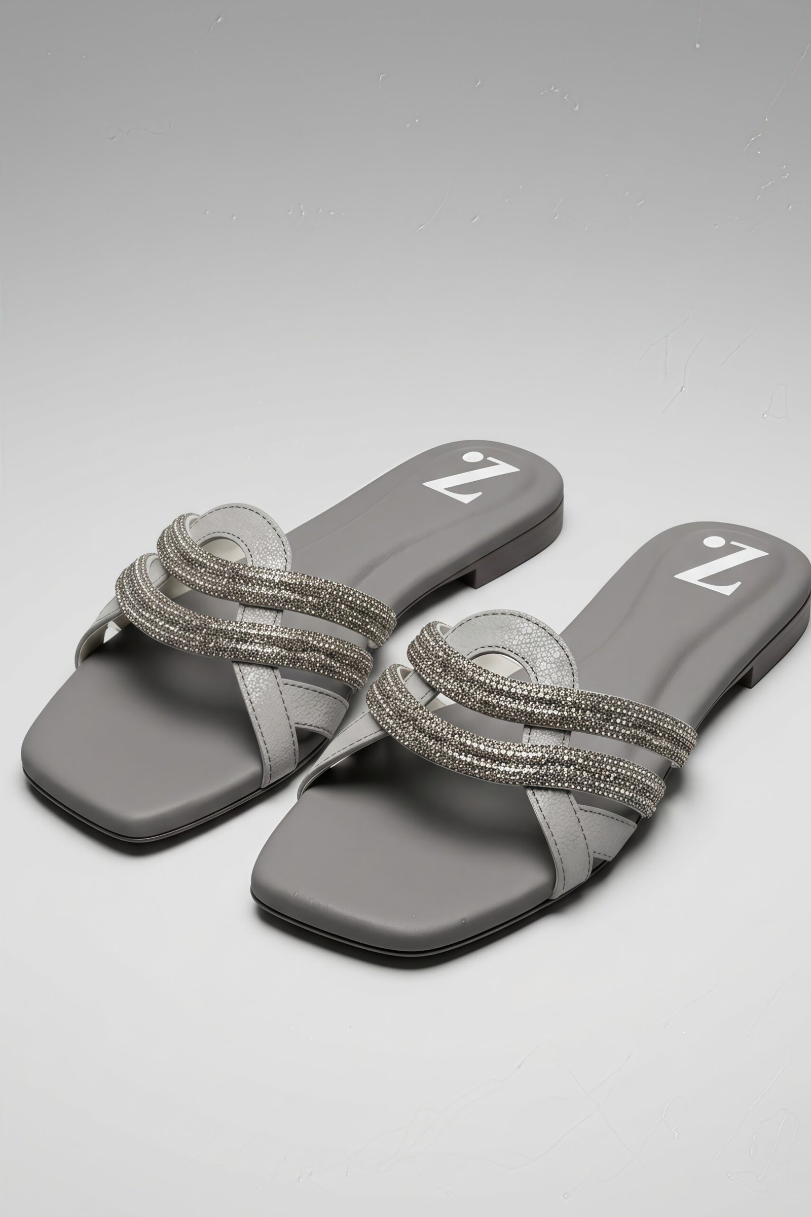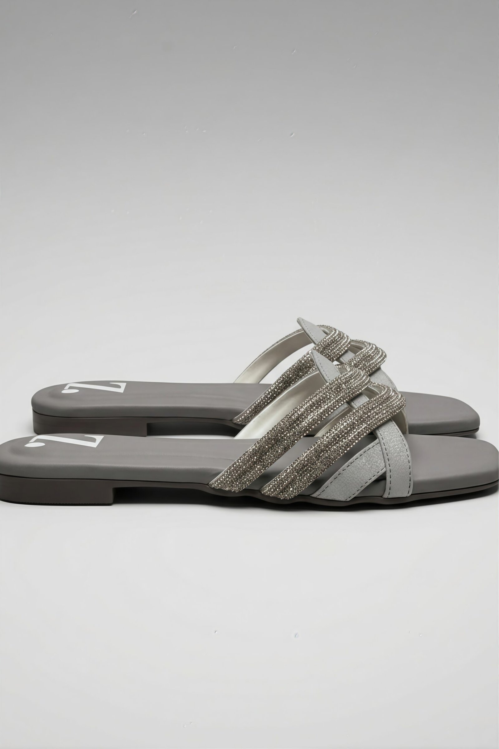Elevate your look with these elegant soft silver slide flat sleepers, featuring a soft, textured strap and soft sole. Designed with a cushioned sole for all-day comfort and balance. Perfect for formal events, parties, or adding a graceful touch to your outfit.