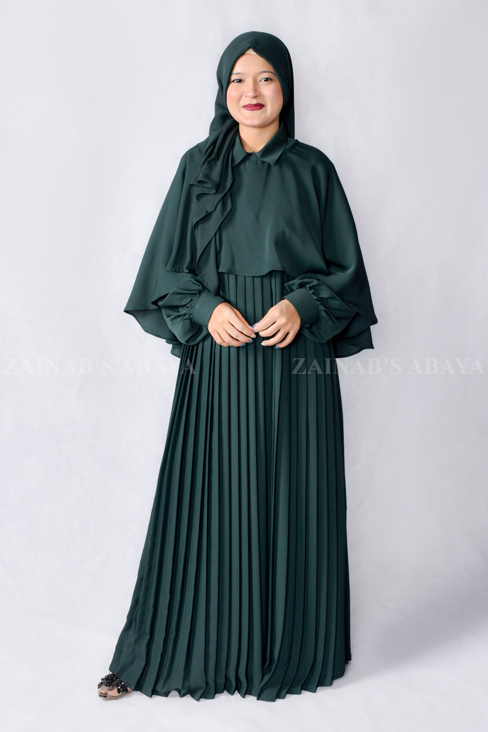 This Maxi Abaya with Shrug is made up of Imported Nida Korean Fabric. This elegant set includes a full-length maxi abaya with a stylish shrug. It features plates on the front and fitted cuff sleeves. Complete with a matching chiffon scarf.