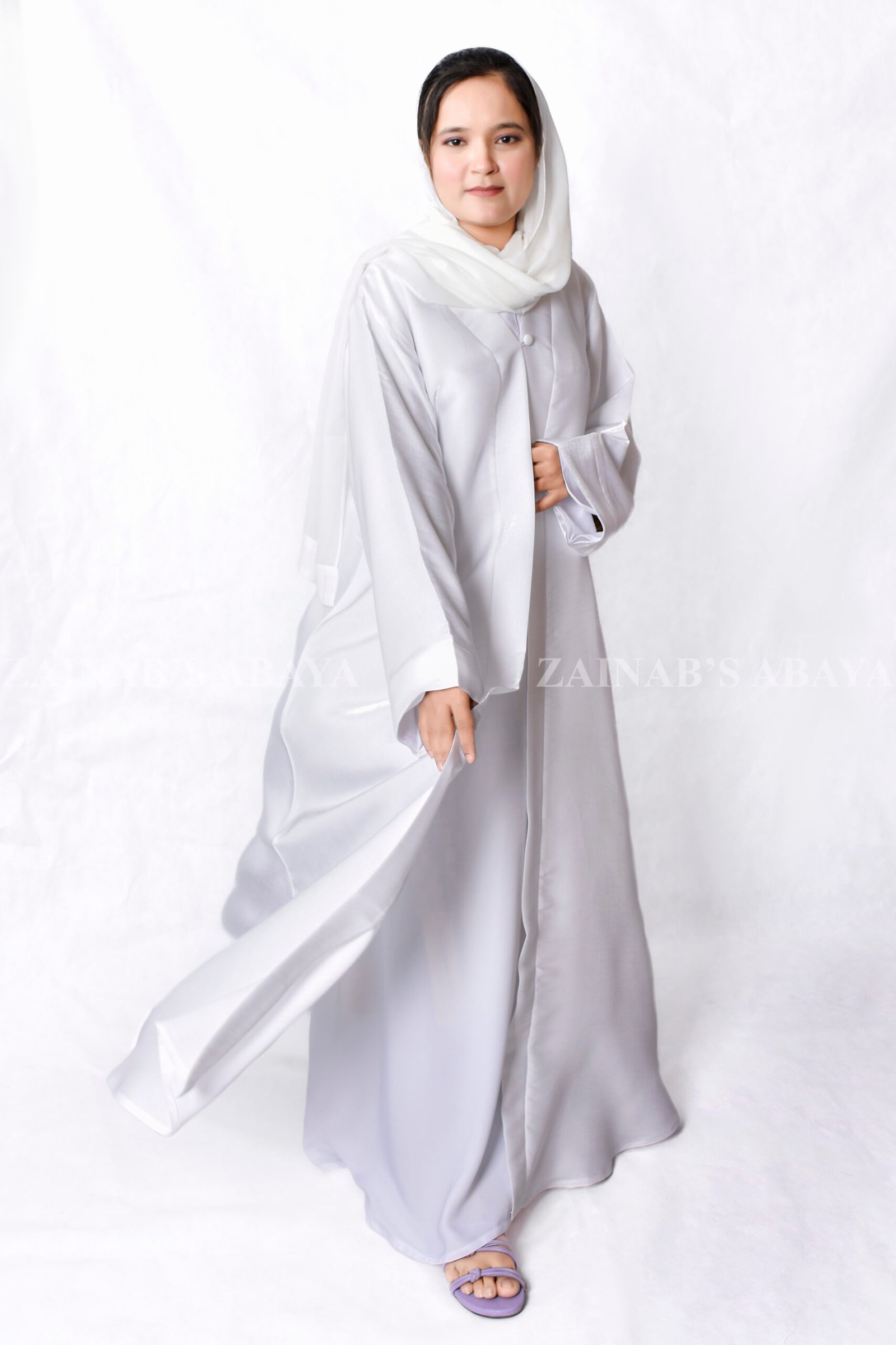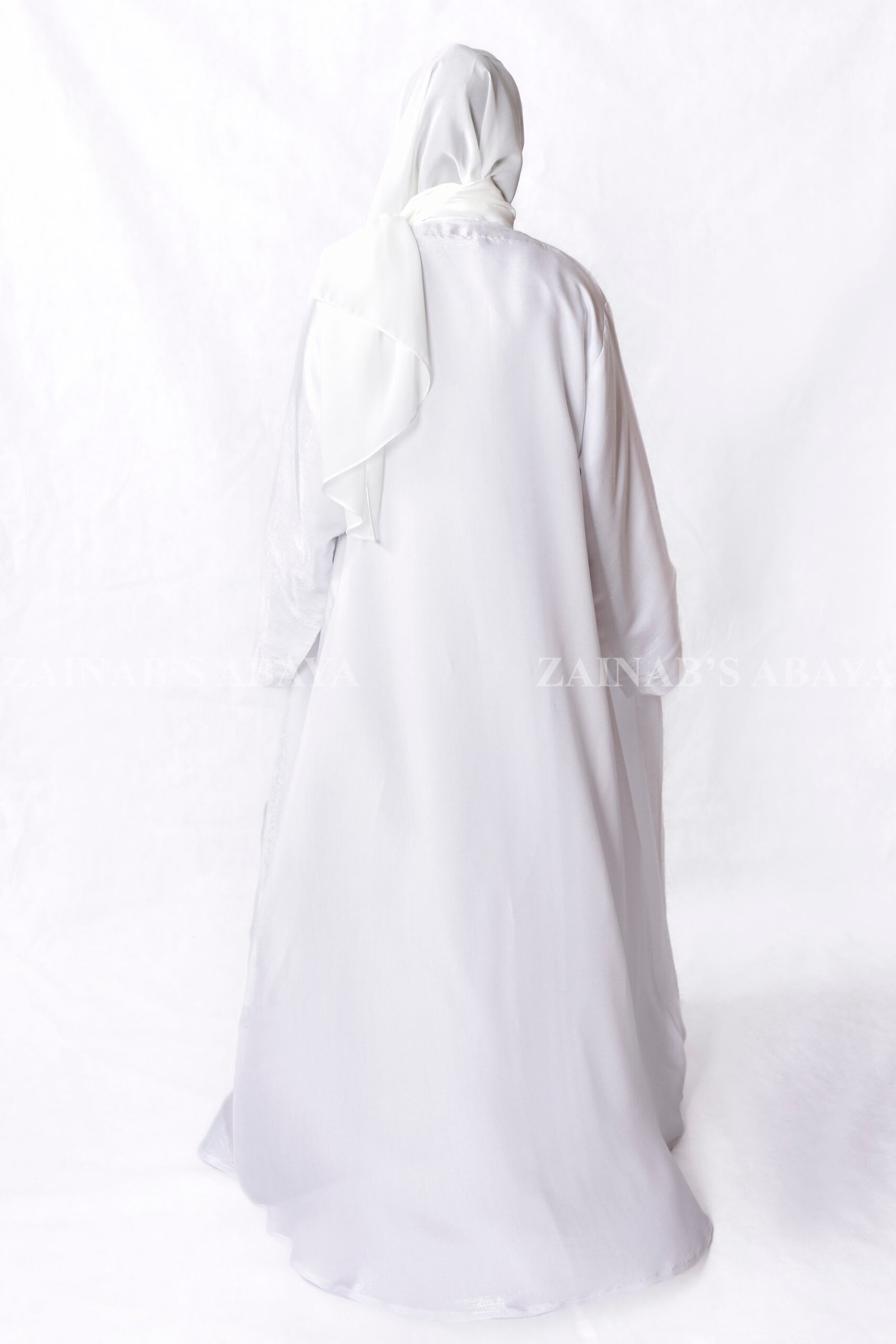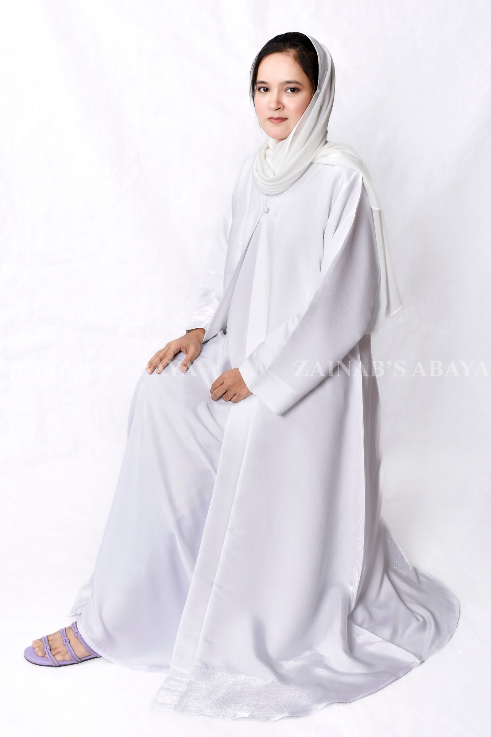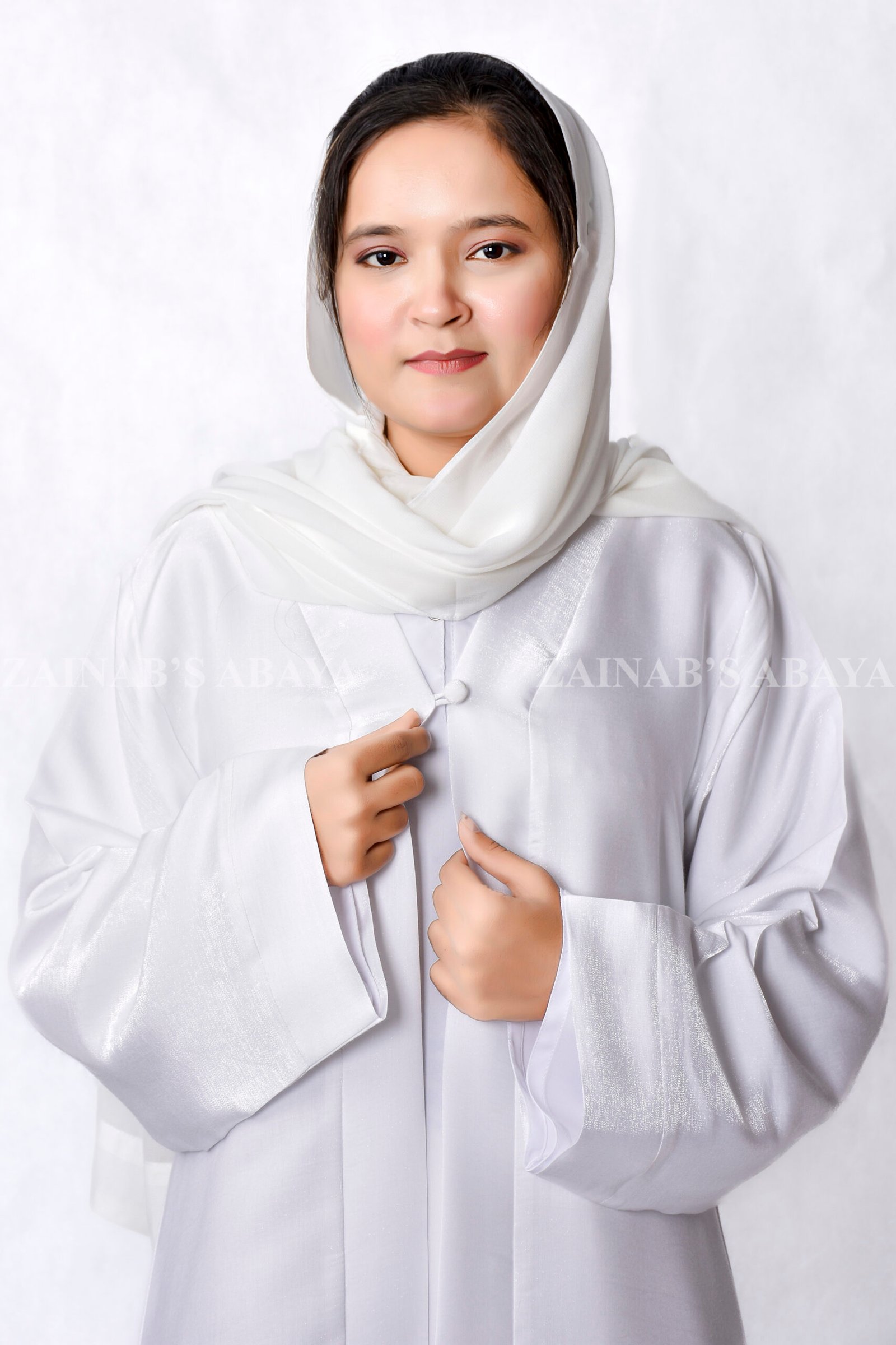 White Color Front Open Abaya with Chiffon Scarf Made from soft Shamooz fabric. Includes a matching color chiffon scarf for a stylish contrast.